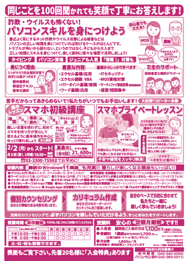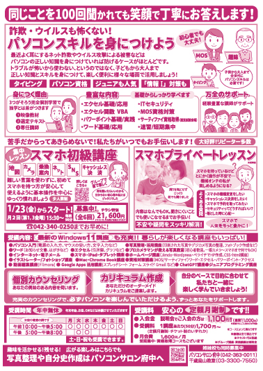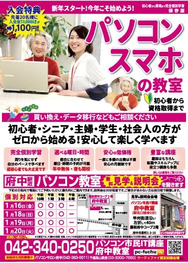 私たちパソコン市民IT講座はパソコンのスキルはもちろん、スマホの使い方についても皆さんのお困りごとや使えない悩みを全力でサポートします。年の始まりの1月、教室説明会を実施します!ぜひこの機会に初めてみませんか?
